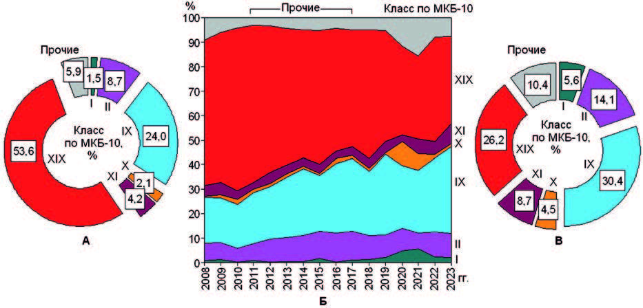Рис. 27. Структура (А) и динамика структуры (Б) смертности сотрудников МВД России, структура смертности населения России в трудоспособном возрасте (В).