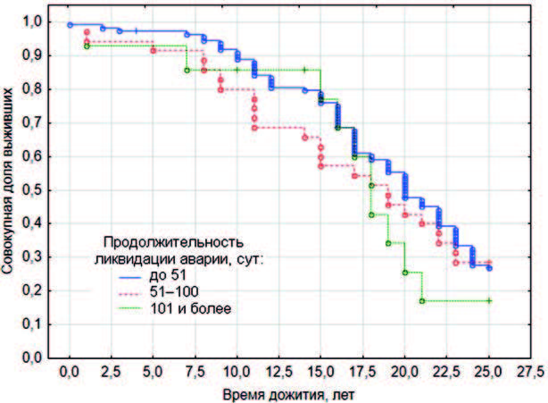 Показатели продолжительности жизни ЛПА не зависели ни от фазы аварии на станции (χ2 = 3,9; р < 0,27), ни от вида работ на объекте (χ2 = 6,8; р < 0,77).