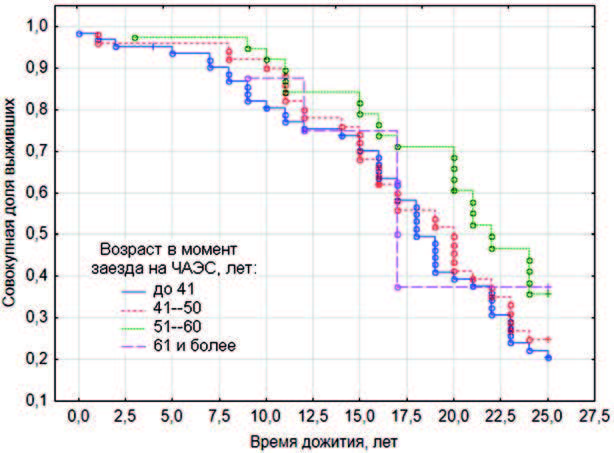 Рис. 5. Функции 25-летнего дожития ЛПА на ЧАЭС в разных возрастных группах (р = 0,21).