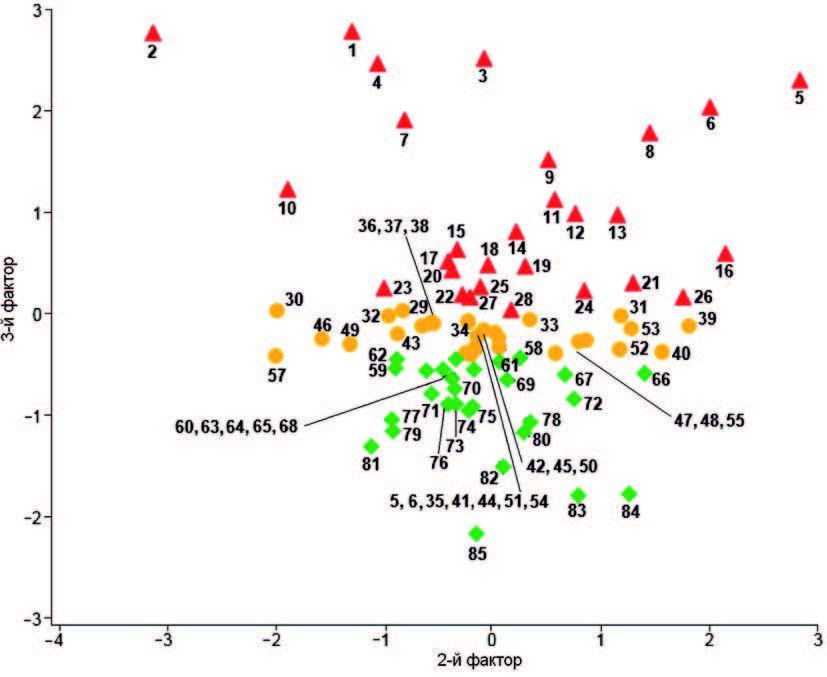 Рис. 3. Распределение субъектов России по значениям 2-го фактора «Обстановка с пожарами» и 3-го фактора «Травматизм при исполнении служебных обязанностей». Цветами показаны субъекты, входящие в красную, желтую и зеленую группы. Цифры – субъекты, описанные в тексте.