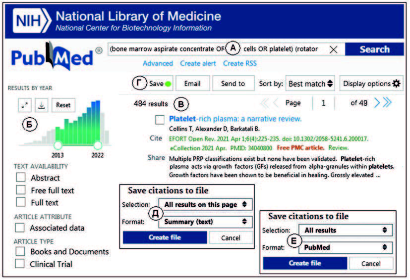 - из слов, соединенных в словосочетании оператором ИЛИ (OR) (bone marrow aspirate concentrate OR stem cells OR platelet), и второго словосочетания (rotator cuff injuries), соединенного с первым словосочетанием при помощи оператора И (AND), который обычно не указывается при поиске (рис. 1А);