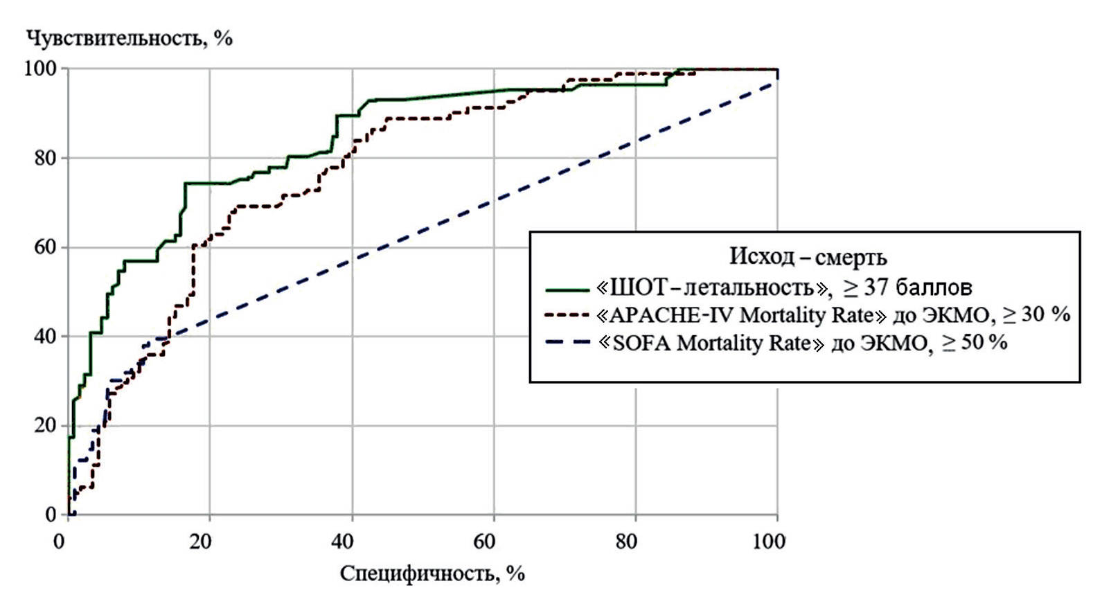 На рисунке представлена визуальная демонстрация характеристик ROC-анализа для трех шкал вероятности прогноза летального исхода, которые применялись на начальном этапе исследования. На основании имеющихся данных и выполненного ROC-анализа, оказалось, что новая шкала «ШОТ–летальность» обладает лучшей чувствительностью (74,4 %) и точностью прогноза (79 %) по сравнению с традиционными шкалами «APACHE-IV Mortality Rate» (68,8 и 72,6 % соответственно) и «SOFA Mortality Rate» (38,8 и 62,6 % соответственно и имеет высокую специфичность (83,5 %) прогноза вероятности летального исхода (p < 0,001) для пострадавших в ЧС и тяжелобольных для принятия решения о целесообразности выполнения медицинской эвакуации.