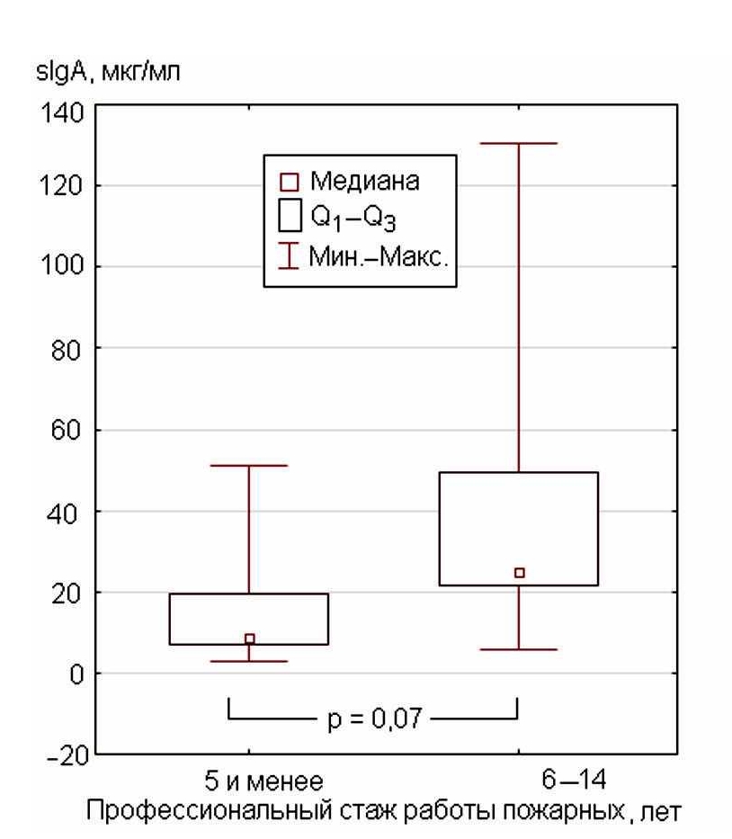 Кроме того, с увеличением стажа работы установлена выраженная тенденция роста содержания sIgA в секрете из носовых ходов (p = 0,07). Так, в группе пожарных со стажем работы 6–14 лет этот показатель превышал значения в группе со стажем менее 5 лет – 25,0 [21, 7; 43, 9] и 8,65 [7, 03; 18, 9] мкг/мл соответственно (рис. 3).