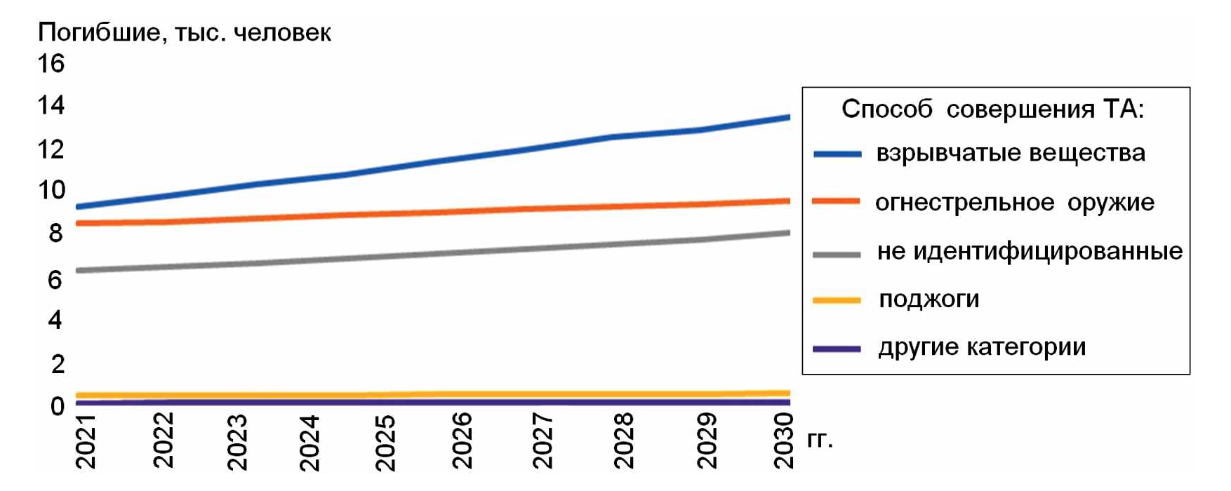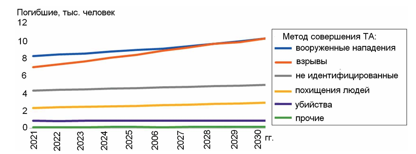 Methods. This study is based on a comprehensive expert database of 1970-2020 terrorist attacks and their consequences. The retrospective analysis covers over 220,000 cases of terrorist action and relies on the following main parameters: terrorist attack tactics, object and tools. The MS EXCEL software was utilized for data analysis to design a predictive model and enhance the accuracy of investigated parameters. The obtained results reflect average values of irretrievable losses across all forecasts.