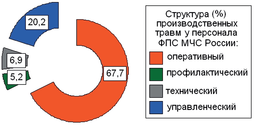 Изучили 1769 производственных травм у личного состава (сотрудников, имеющих специальные звания, и работников) ФПС МЧС России в 2012–2021 гг., в том числе, у оперативного персонала – 1198, профилактического – 92, технического – 122, управленческого – 357. На рис. 1 показана структура производственных травм по категориям личного состава.