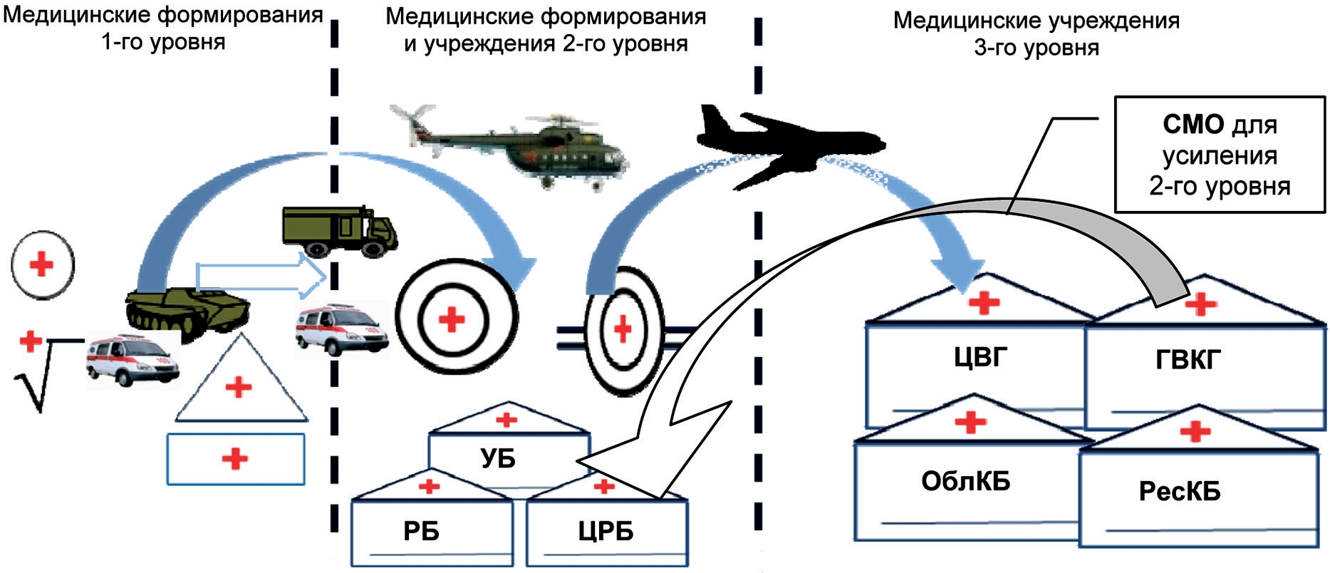 Рис. 3. Схема формирования лечебно-эвакуационного направления при возникновении очага санитарных потерь. УБ – участковая больница; ЦРБ – центральная районная больница; РБ – республиканская больница; ЦВГ – центральный военный госпиталь; ГВКГ – главный военный клинический госпиталь; ОблКБ – областная клиническая больница; РесКБ – республиканская клиническая больница.