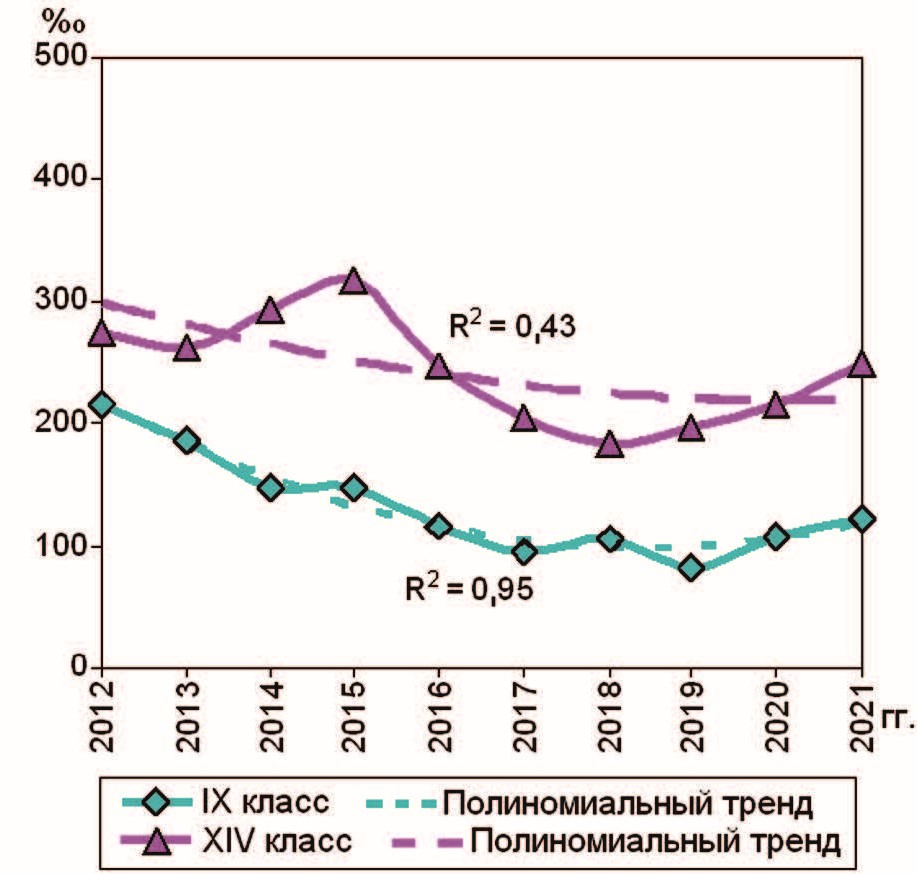 770.6 ‰, regular follow-up – 186.3 ‰, hospitalization – 347.2 ‰, cases requiring a sick leave due to disability – 898.9 ‰, days of disability-related absence from work – 6964 ‰, dismissal rate – 5.11 ‰, mortality rate – 59.2 ∙ 10–5. Polynomial trends in morbidity tracking indicated decreasing trends, with varying significance of determination coefficients. In terms of their social and epidemiological significance, 8 disease chapters (listed in order of severity according to ICD-10) were the major contributors to the military women morbidity: diseases of the respiratory systems (Chapter X), neoplasms (Chapter II), diseases of the circulatory system (Chapter IX), diseases of the musculoskeletal system and connective tissue (Chapter XIII), diseases of the genitourinary system (Chapter XIV), endocrine, nutritional and metabolic diseases (Chapter IV), injury, poisoning and certain other consequences of external causes (Chapter XIX), diseases of the digestive system (Chapter XI).