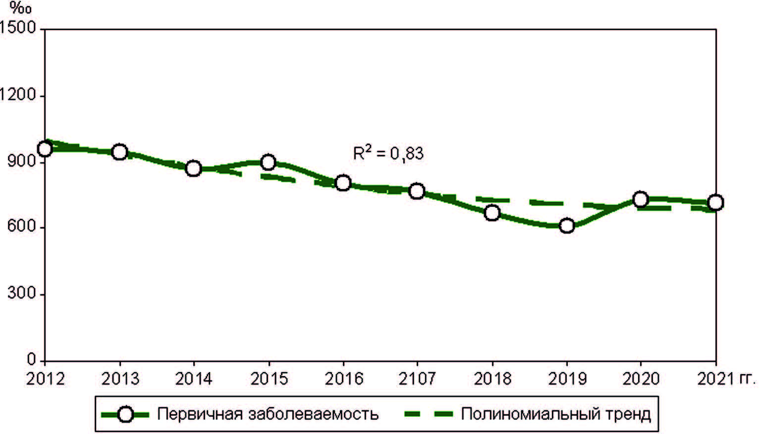 Results and discussion. The long-term average incidence (total morbidity) was 1653.1 ‰, with primary morbidity –
