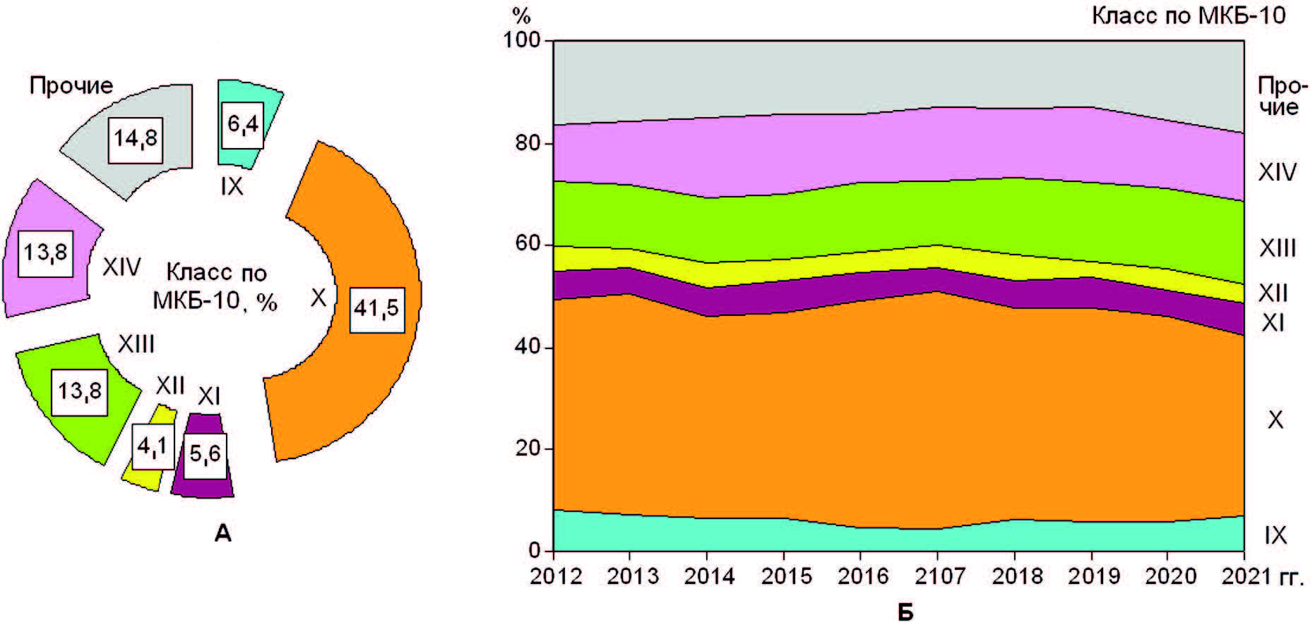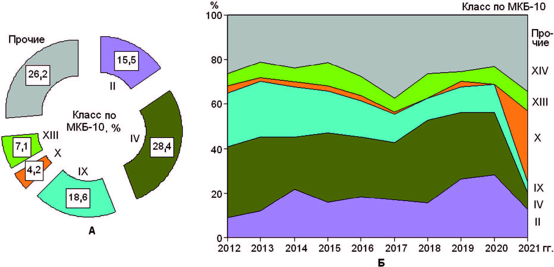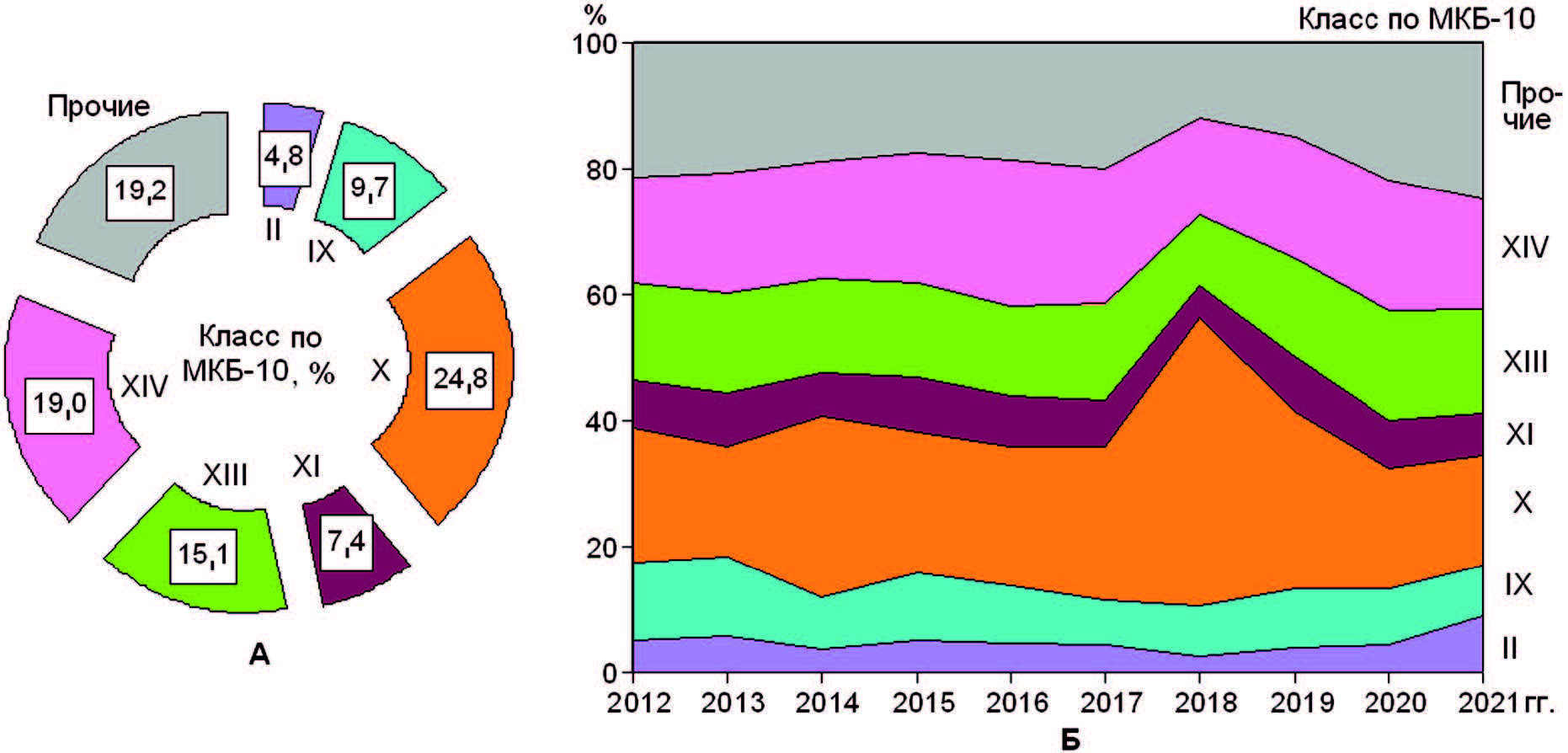 Структура данных о смертности от болезней и травм по 4 ведущим классам наглядно показана на рис. 24А, динамика структуры – на рис. 24Б. Доля представленных показателей по классам болезней составила 90,7 %, по прочим классам – 9,3 %. В динамике структуры смертности выявлены тенденции увеличения долей болезней органов дыхания (X класс) и органов пищеварения (XI класс), уменьшение долей – новообразований (II класс) и травм, отравлений и некоторых других последствий воздействий внешних причин (XIX класс) (см. рис. 24Б).