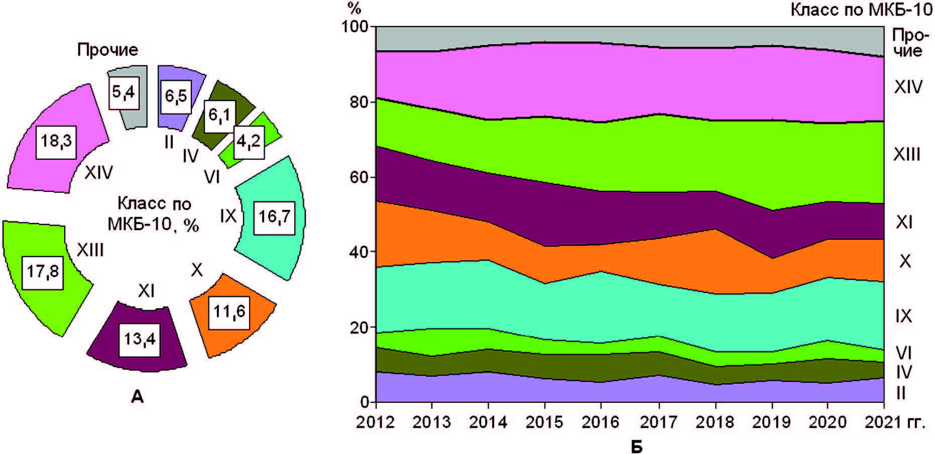 Медико-статистические показатели соотнесли с основными классами болезней и причин смерти, принятых в Международной статистической классификации болезней и проблем, связанных со здоровьем, 10-го пересмотра (МКБ-10) (табл. 1) [https://mkb-10. com/]. При анализе болезней по МКБ-10 акцент делали на ведущие классы, показатели которых имели вклад в структуру не менее 4 %.