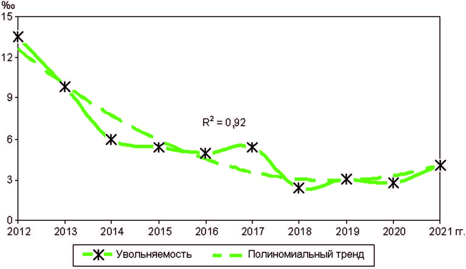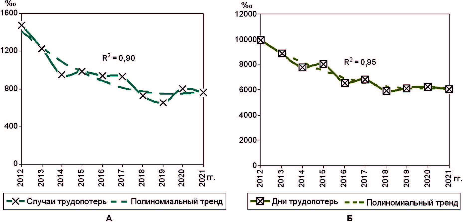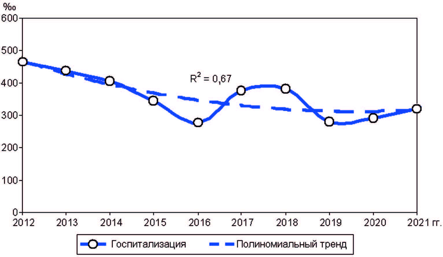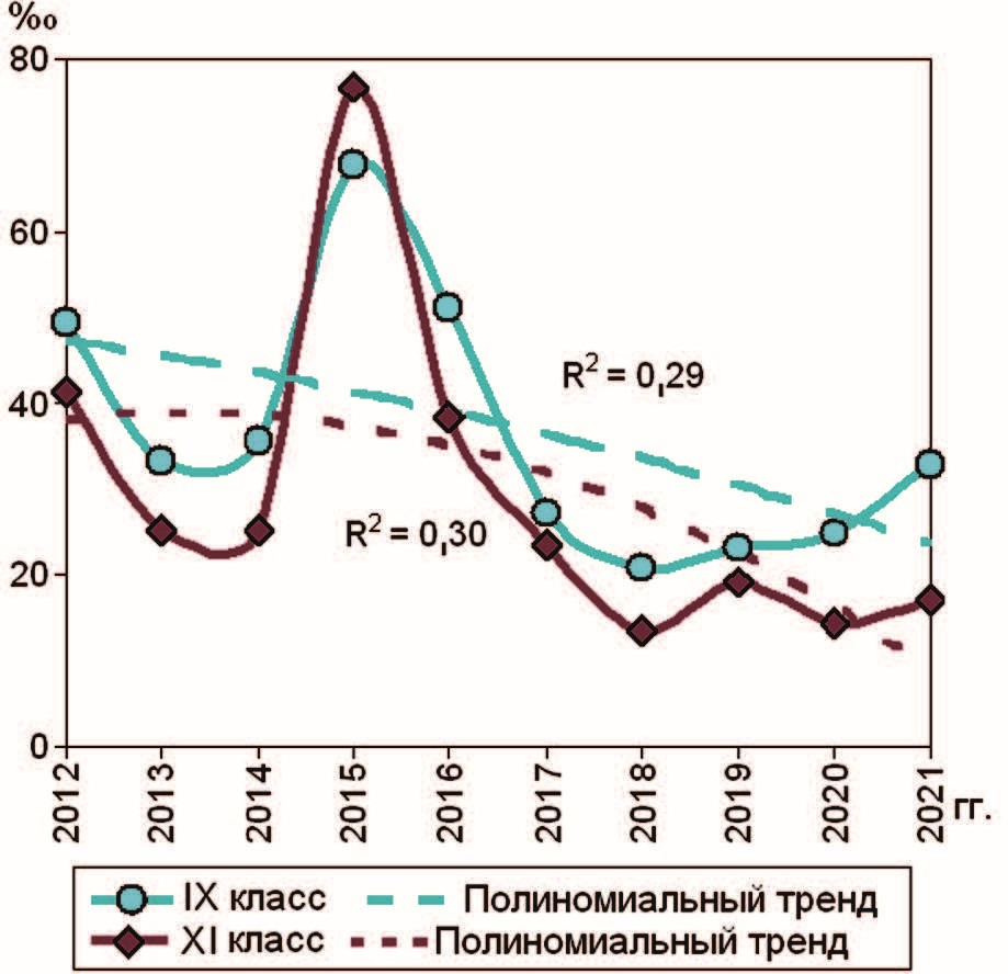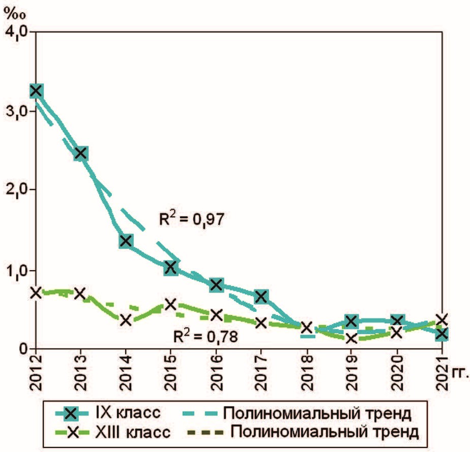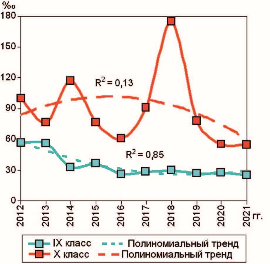 Динамику показателей оценивали с помощью анализа динамических рядов и расчета полиномиального тренда 2-го порядка [9]. Коэффициент детерминации (R2) показывал связь построенного тренда с данными, чем больше был R2 (максимальный 1,0), тем больше приближался он к реально наблюдавшимся данным. Значок ↑ в таблицах показывает тенденцию роста динамики данных, ↓ – уменьшение, → – стабильности, ∪ – U-кривую, ∩ – инвертируемую U-кривую. В ряде случаев правый край тренда был больше (меньше) левого, в этом случае к U-кривой добавляли знаки ↑(↓).