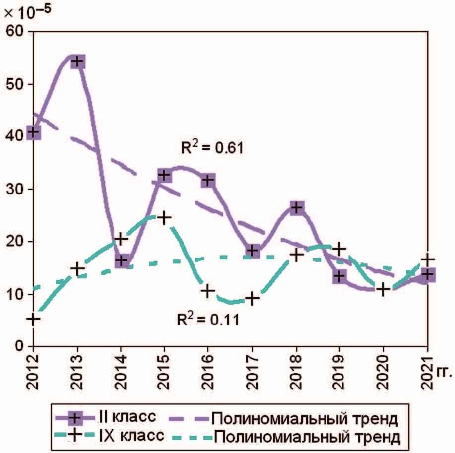 На рис. 25, 26 показана динамика показателей смертности от болезней и травм по классам болезней, составивших наибольшие доли в структуре. При разных по значимости коэффициентах детерминации полиномиальные тренды уровней смертности военнослужащих- женщин от новообразований (II класс) (см. рис. 25) и травм, отравлений и некоторых других последствий воздействий внешних причин (XIX класс) (см. рис. 26) демонстрировали тенденции уменьшения данных, от болезней системы кровообращения (IX класс) (см. рис. 25) и органов пищеварения (XI класс) (см. рис. 26) – тенденции увеличения показателей.