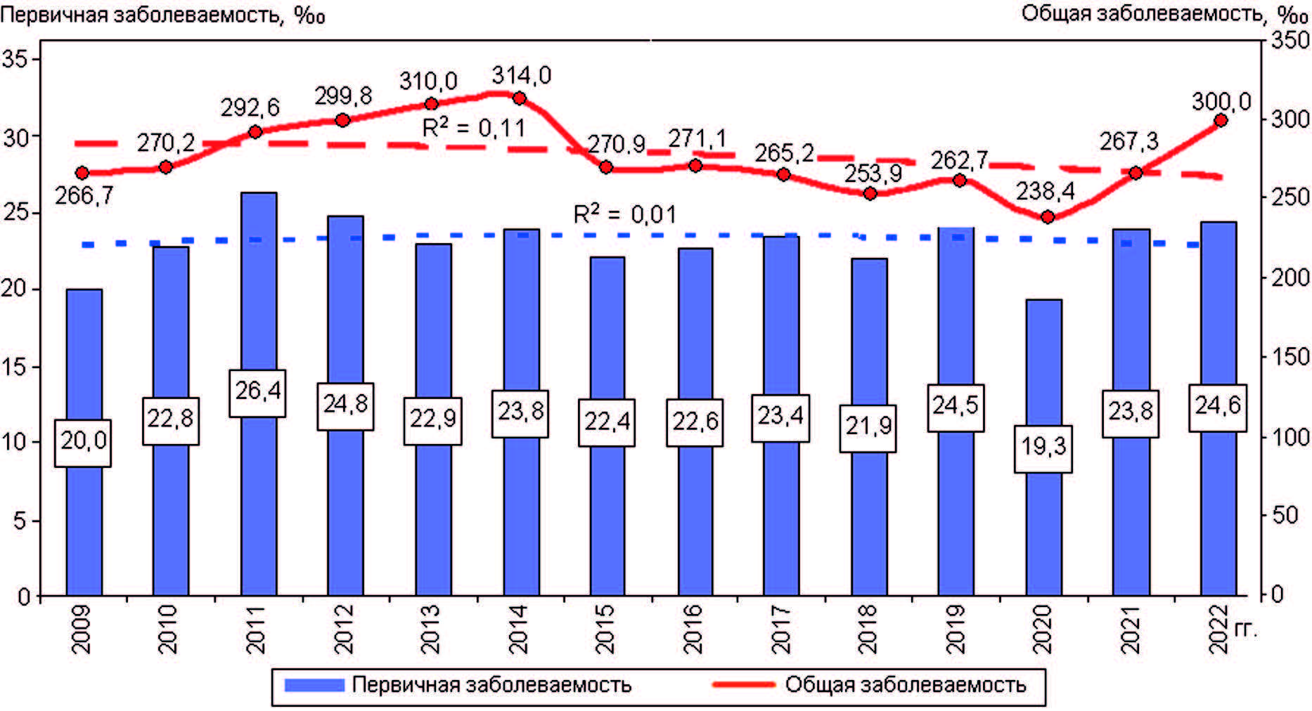Заболеваемость. Динамика значений показателей общей и первичной заболеваемости населения Республики Коми БСК представлена на рис. 1. Среднегодовой показатель общей заболеваемости населения БСК за 14 лет (2009–2022 гг.) составил (277,3 ± 5,9) ‰, первичной – (23,1 ± 0,5) ‰. При очень низком коэффициенте детерминации полиномиальный тренд уровня общей заболеваемости являлся нисходящим, что можно объяснить снижением обращаемости населения за профильной медицинской помощью в последние годы, в том числе, в связи с переориентацией регионального сегмента государственной системы здравоохранения на лечение больных COVID-19. Тренд уровня первичной заболеваемости БСК остается нейтральным.