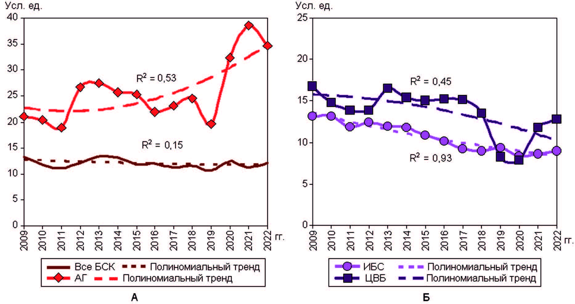 Среднее значение коэффициента хронизации БСК за 14 лет составило 12,0, в том числе, АГ – 25,7, ИБС – 8,5, ЦВБ – 11,5. Динамика значений коэффициентов всех БСК и АГ приведена на рис. 3А, ИБС и ЦВБ – на рис. 3Б.