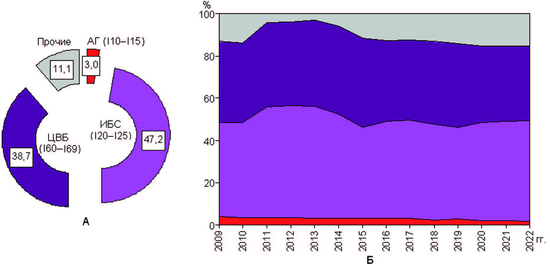 Рис. 5. Нозологическая структура (А) и динамика структуры (Б) причин смерти от БСК населения Республики Коми в 2009–2022 гг. (%).