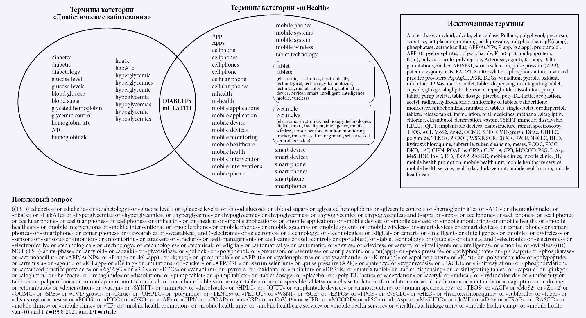 Рис. 1. Диаграмма Венна, обобщающая термины из категорий Diabetes + mHealth, и результирующий запрос