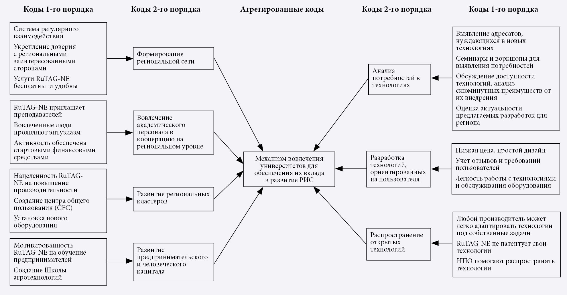 Полученная информация индуктивно кодировалась программным обеспечением MAXQDA, что позволило установить значимые связи между результатами опросов и литературой по возникающим и мейнстримным темам. Данным присваивались коды разных порядков. К первому относились маркеры, идентифицирующие респондентов. Вторая категория носила более абстрактный характер, отражая концепции и профессиональные интересы конкретных исследователей, тогда как третья выполняла интегрирующую роль (рис. 1). На старте использовались коды первого порядка, позволявшие оценить мнения участников в отношении роли IIT Guwahati в РИС (левая часть рис. 1) и деятельности RUTAG-NE по совместной разработке технологий для компаний (правая часть рис. 1). Посредством интегральных кодов анализировались направления участия университета в РИС, включая формирование региональных сетей, развитие региональных кластеров с привлечением вузовских экспертов, поддержку активности и наращивание человеческого потенциала в предпринимательской сфере. Деятельность RUTAG-NE обсуждалась с позиций сканирования технологических потребностей, разработки ориентированных на пользователя технологий и их распространения по принципу открытости.