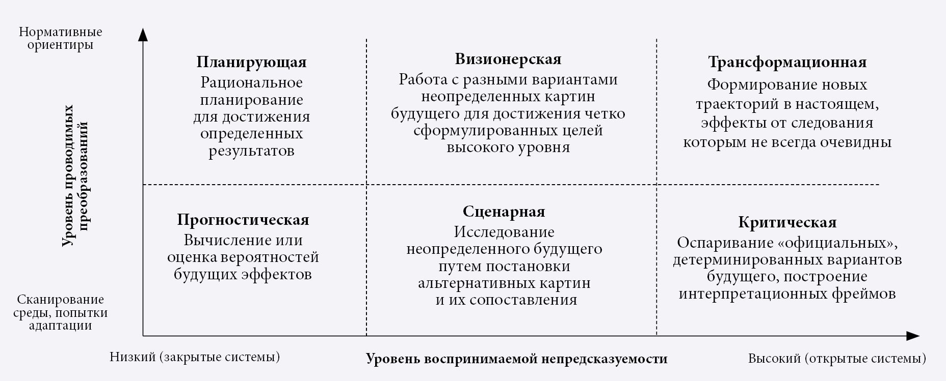 На рис. 2 представлена классификационная матрица для шести рамочных основ Форсайт-проектов (Minkkinen et al., 2019). Большинство оценочных методологий, применяемых в корпоративной практике и научных кругах, базируется только на двух из них: измеряются точность прогнозов и степень достижения запланированных результатов (Bonaccorsi et al., 2020). Это обусловлено тем, что прогнозирование и планирование имеют дело с низким уровнем непредсказуемости. Соответственно, другие направления (визионерское, сценарное, трансформационное, критический анализ) отражаются в меньшей степени, поскольку относятся к зоне повышенной неопределенности и их сложнее оценивать (Cuhls, 2003).