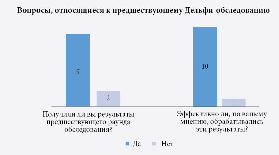 В изученном нами Дельфи-обследовании уровень вовлечения политиков был недостаточным, что сказалось на ненадлежащем распространении результатов и, как следствие, слабом влиянии на принятие решений. С другой стороны, неудовлетворительный эффект можно рассматривать как стартовую точку для того, чтобы переосмыслить подходы к организации последующих Форсайт-проектов, повысить качество коммуникации между участниками и обеспечить их глубокую вовлеченность.