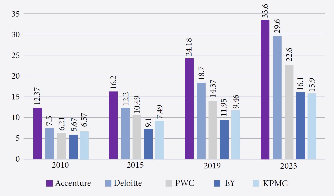 Рис. 2. Динамика выручки Accenture и «большой четверки» международных аудиторских компаний от услуг управленческого консалтинга (млрд долл.)