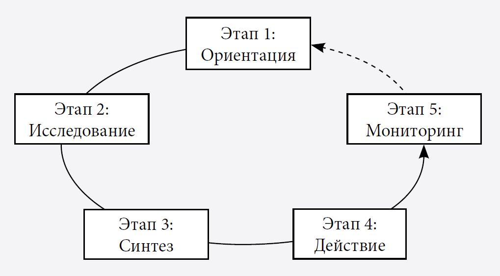 Сценарное планирование — один из наиболее распространенных типов Форсайт-исследований, нашедший свое применение и в нефтехимической промышленности в силу сложности и нелинейности динамики ее развития (Rubio et al., 2023; Guivarch et al., 2017; Khosala et al., 2021; Parajuli, 2015; Matsumoto,Voudouris, 2015; Paltsev, 2014). При разработке сценариев будущего иранской нефтехимической отрасли нами был применен комплексный подход. В структурном отношении исследование следует модели Глобальной бизнес-сети (Global Business Network, ГБС) (Scearce, Fulton, 2004), включающей пять основных этапов: ориентацию, исследование, синтез, действие и мониторинг (рис. 2).