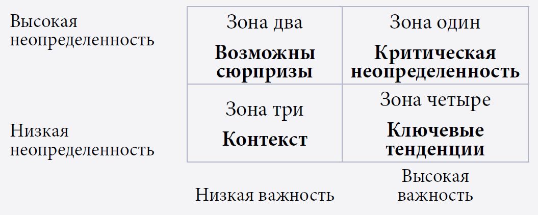 На данном этапе вся разнородная совокупность факторов, выявленных на предыдущей стадии, синтезируется и интегрируется. Суть этапа состоит в ранжировании факторов и отборе двух–трех наиболее релевантных для ответа на главный вопрос или проблему исследования. Обычно такие факторы относятся к числу критических неопределенностей и ложатся в основу сценариев. Исключение тех или иных факторов может порождать сомнения в ценности работы, однако в дальнейшем к ним всегда можно вернуться.
