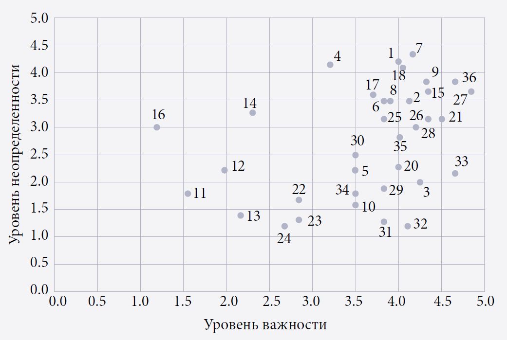 Круг факторов, влияющих на будущее развитие отрасли, был проанализирован с помощью матрицы важности/неопределенности в рамках опроса экспертов. Матрица послужила инструментом классификации факторов, выявленных на предыдущих этапах исследования. Распределение отражает их положение и роль в разработке сценариев, структура и содержание которых определялись на основе интерпретации квадрантов матрицы (рис. 4).