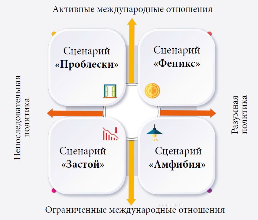 По результатам анализа и применения исследовательской матрицы наиболее важными и неопределенными факторами развития иранской нефтехимии оказались внешнеполитические (отношения с широким и узким кругом стран) и связанные с экономической (разумной или непоследовательной) политикой правительства. На базе матричной логики были определены верхние границы двух факторов по двум направлениям — в сторону улучшения и ухудшения ситуации, — на основе взаимодействия которых (рис. 7) были разработаны четыре сценария: «Феникс», «Проблески», «Застой» и «Амфибия» (рис. 8). Отметим, что эти сценарии определяются текущим состоянием выявленных групп ключевых факторов; помимо общей картины будущего, в каждом случае описывается их возможный эффект.