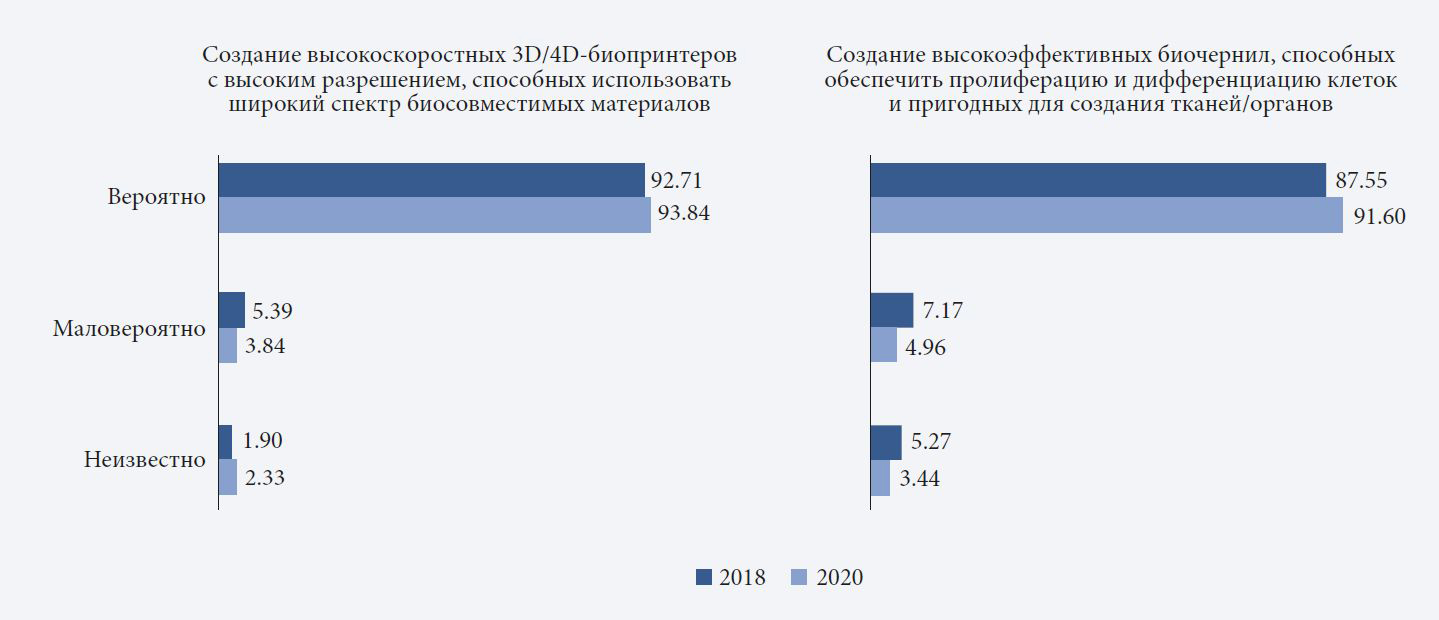 Недавно появилась технология 5D-биопечати для создания васкуляризованных моделей (Foresti et al., 2020), воспроизводящая более сложные системы изогнутой формы (Kumar et al., 2019). Печать выполняется под пятью разными углами с помощью вращающихся печатающих головок (Dey, Ozbolat, 2020). В свою очередь 3D/4D-биопринтеры используют печатающую головку только под фиксированным углом (Ahmad et al., 2019). Однако ни одна из упомянутых возможностей не будет реализована без совершенствования биопринтеров и биочернил. Под последними понимаются разнообразные жидкости, содержащие биоматериалы либо живые клетки — от гидрогелей (с использованием альгината, коллагена, фибрина, метакрилата желатина) до клеточных агрегатов, микроносителей и децеллюляризованных матриц (Whitford, Hoying, 2016; Hospodiuk et al., 2017; Gungor-Ozkerim et al., 2018). В настоящее время наиболее распространены три вида биопечати — струйная, экструзионная и лазерная (Sears et al., 2016; Vijayavenkataraman et al., 2018; Dias et al., 2020; Zhang et al., 2020), но все они остаются медленными и трудоемкими (Duan, 2017). По мнению свыше 90% экспертов, к 2038 г. будут разработаны скоростные 3D/4D-биопринтеры с высоким разрешением, поддерживающие широкий спектр биосовместимых материалов (Park et al., 2016; Heinrich et al., 2019). Появятся высокоэффективные биочернила, обеспечивающие пролиферацию и дифференциацию клеток, производство тканей и органов (Mosadegh et al., 2015; Albritton, Miller, 2017; Huang et al., 2017; Mori et al., 2018). В обоих раундах более 87% опрошенных отметили, что технология биочернил, вероятно, достигнет такого уровня до 2038 г. От наличия у биочернил соответствующих свойств зависит биологическая функциональность биопечатных конструкций (Murphy et al., 2020). Отсутствие высокоэффективных биочернил ограничивает прогресс инжиниринга тканей и внедрение результатов исследований в клиническую практику (Mori et al., 2018). В перспективе биопринтеры смогут комбинировать разные биочернила со скоростью, обеспечивающей васкуляризацию, рост и дифференциацию клеток, что позволит нарастить объемы создания тканей (Dias et al., 2020).