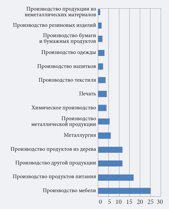Анкета, адресованная руководителям инновационных подразделений и владельцам предприятий, включала общую информацию о Форсайт-исследованиях, проводимых в компаниях, оценку факторов зрелости и соответствующие метрики. Структура выборки предприятий по размеру, типу и территориальному уровню деятельности приведена в табл. 3, распределение по отраслям отражено на рис. 1.