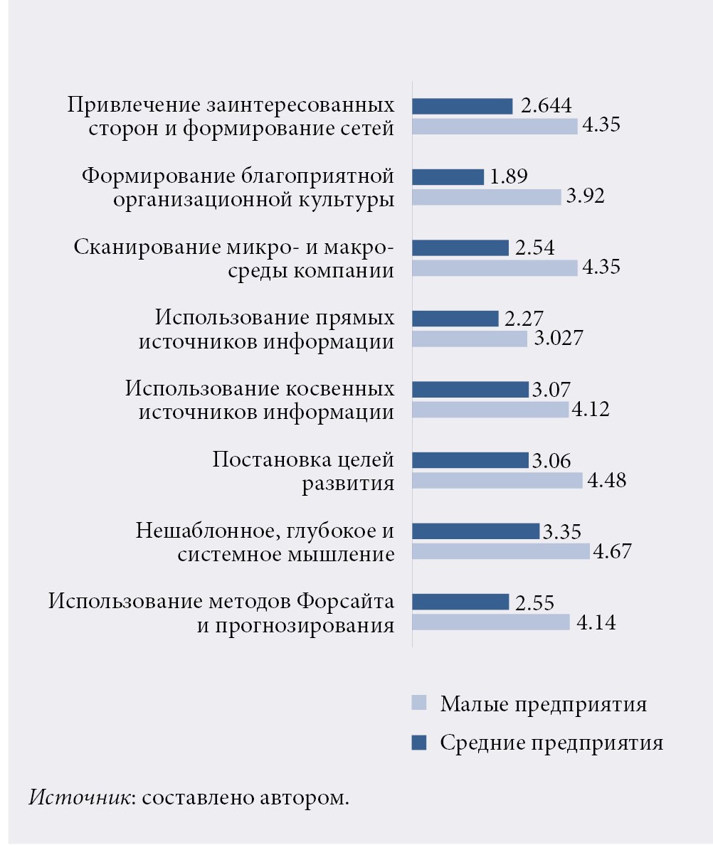 Предпринятый анализ привносит количественное измерение в исследования факторов Форсайт-зрелости предприятий, ранее обычно полагавшиеся на качественные критерии (Grim, 2009; Rohrbeck, 2010). По итогам факторного анализа уточнено определение Форсайт-зрелости МСП, выявлены 28 характеризующих ее факторов, сгруппированных по восьми измерениям. Заинтересованным в повышении своей Форсайт-зрелости МСП следует развивать и внедрять в повседневную практику механизмы вовлечения стейкхолдеров в формирование сценариев будущего, сканирования микро- и макроконтекста, общего культивирования созидательной организационной среды. Не менее ценными становятся умения работать с неявными источниками информации, ставить реалистичные цели, мыслить нестандартно, глубоко и системно.