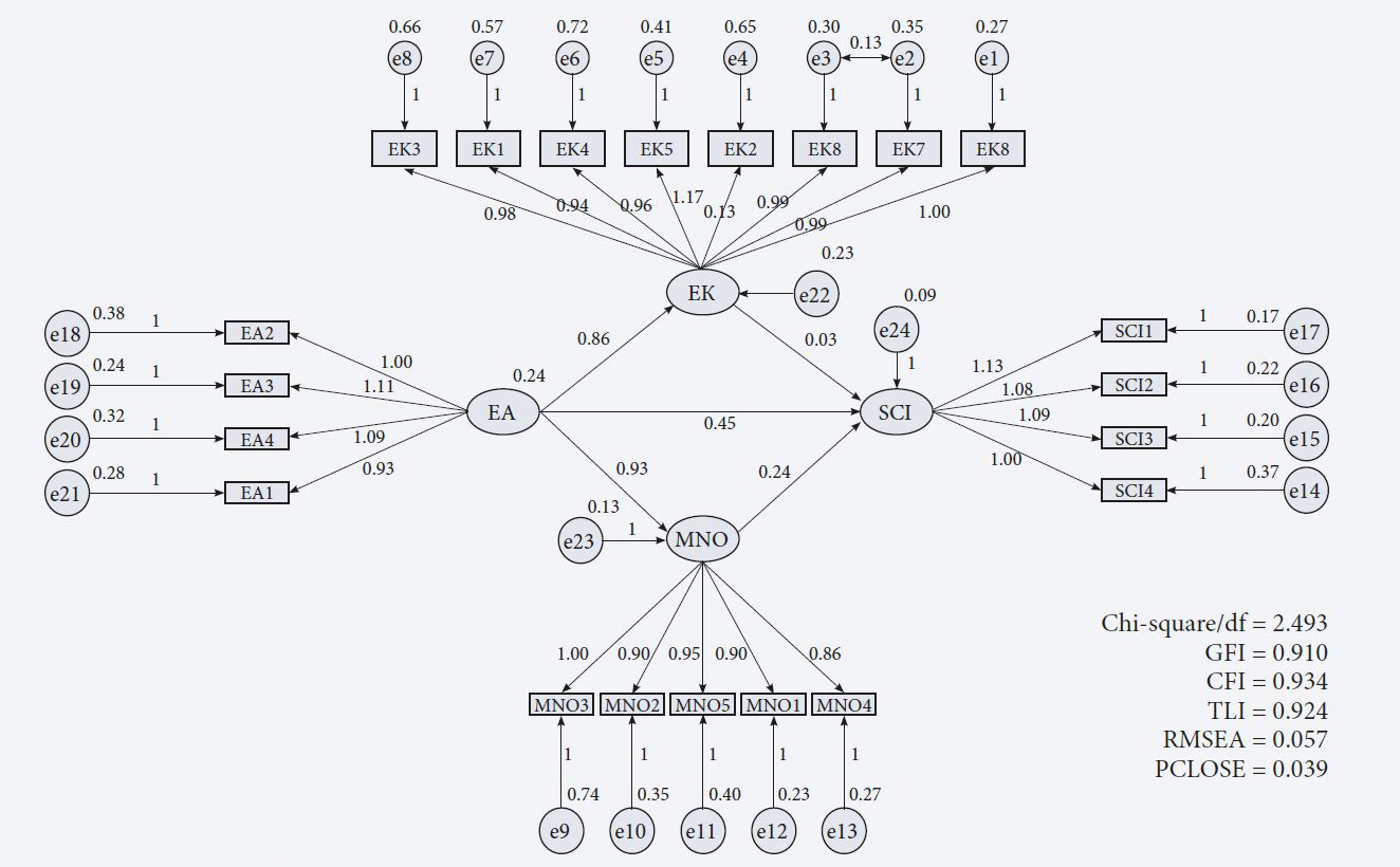 Для выявления связи между различными переменными и проверки гипотез применялись передовые статистические методы, такие как моделирование структурными уравнениями (Structural Equation Modeling, SEM) с использованием программного обеспечения AMOS.22 (Wang, Rhemtulla, 2021). Подтверждающий факторный анализ (Confirmatory Factor Analysis, CFA) и другие подходы служили оценке обоснованности и надежности таких теоретических конструктов. Вес и уровень достоверности каждого понятия приведены в табл. 5. Конструкты знания об экологических проблемах, отношения к природе, зеленой рекламы и стремления к устойчивому потреблению обладают сильной внутренней согласованностью, что подтверждается высокими показателями коэффициентов альфы Кронбаха: 0.855–0.871 для знания окружающей среды (EK) и 0.730–0.774 — для отношения человека к природе (MNO). Стремление к устойчивому потреблению (SCI) и экологическая реклама (EA) также демонстрируют различия и варьируют в диапазоне 0.734–0.790. Значение альфы Кронбаха выше 0.7 указывает на сильную и устойчивую связь между скрытыми и наблюдаемыми переменными (de Leeuw et al., 2019) (табл. 5).