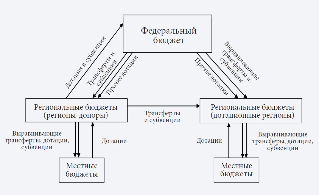Российская бюджетная система состоит из федерального, регионального и местного уровней6 (рис. 1). Бюджетные средства распределяются между территориями посредством выравнивающих трансфертов (дотаций), иных субсидий, субвенций7, прочих межбюджетных потоков, в том числе направляемых в государственные внебюджетные фонды (Martinez-Vazquez, Searle, 2007). Под ФД понимается распределение полномочий между центральными и субнациональными властями для принятия решений, включая агрегирование и последующее перераспределение доходов. Парадокс в том, что последние вначале направляются в «центр», который перераспределяет их между регионами. На это требуется больше времени, что создает фискальные диспропорции и затрудняет реализацию проектов устойчивого развития (Martinez-Vazquez et al., 2017; Martinez-Vazquez, Searle, 2007). В России федеральный бюджет аккумулирует поступления от налогов, штрафов, ренты природных ресурсов, в том числе сборы по некоторым региональным налогам8. Для реализации национальных проектов регионы получают от центра фискальную помощь в различных формах. В случае профицита часть этих активов возвращается в «центр» в форме дотаций и субвенций (рис. 2). Иногда проекты получают межрегиональную поддержку, что позволяет более гибко перераспределять финансы между городами и поселками. Неизрасходованные средства возвращаются на региональный уровень.9