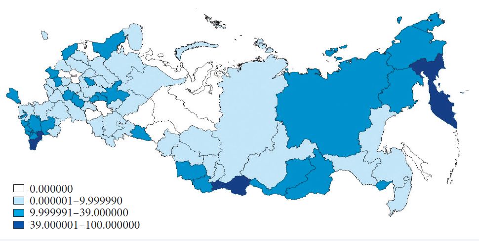 Влияние региональных различий на экономическое неравенство, уровень жизни и занятости, структуру населения и т. д. отмечено в ряде исследований (Zubarevich, Safronov, 2011; World Bank, 2018). Степень развития регионов исторически определялась наличием обрабатывающей, оборонной и горнодобывающей отраслей, что обусловило сильный разрыв между ними5. Другой усиливающий его фактор — отсутствие фискальной межведомственной координации на разных уровнях (Zhuravskaya, 2000). Значимую роль играет также инерционное следование советским экономическим паттернам и, соответственно, низкая эффективность государственного управления (Shleifer, 1997).