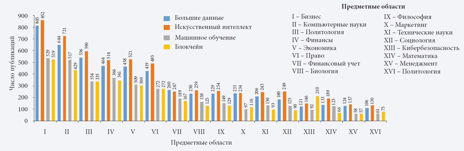 На рис. 3 представлены результаты анализа соответствующих критериям исследования публикаций в Scopus, по ключевым словам «большие данные», «ИИ», «машинное обучение», «блокчейн» и «корпоративное управление». Всего обнаружено 3453 документа, которые были разделены на 16 категорий (бизнес, менеджмент, бухгалтерский учет, экономика, финансы, социальные науки и др.).