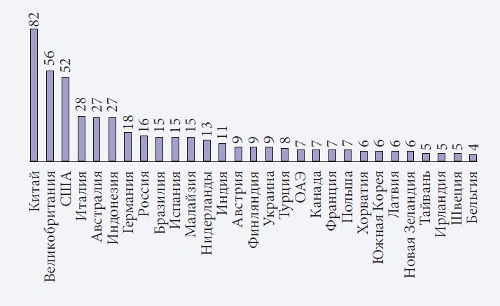 На рис. 9 показаны топ 30 стран по числу публикаций в OpenAlex, посвященных связи между рассматриваемыми технологиями и организационным управлением. В их число входят Китай, Великобритания, США, Италия, Австралия и Индонезия, что указывает на значительный интерес с их стороны к применению соответствующих инструментов.