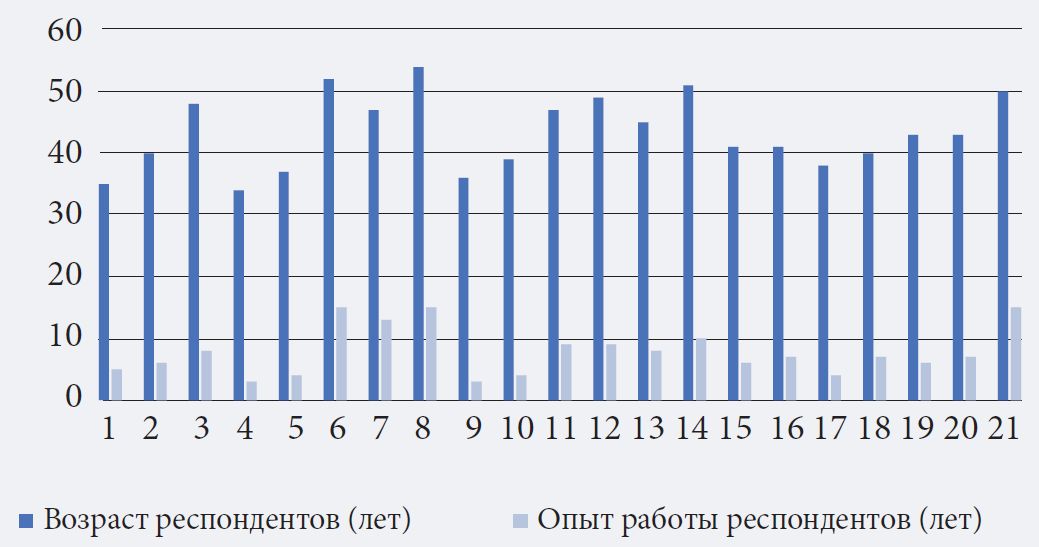 В соответствии с обозначенной исследовательской задачей использовался эмпирический качественный подход, позволяющий максимально полно учесть и глубже понять различные точки зрения на ситуацию и существующий опыт в этом отношении (Creswell et al., 2007; Salloum et al., 2021). Проводились очные полуструктурированные интервью с риск-менеджерами (21 респондент) — представителями крупных банков, имеющих системную значимость для израильской экономики. Отбор осуществлялся таким образом, чтобы обеспечить достаточную репрезентативность банков с точки зрения охвата (национальные, международные), специализации (ипотечные и др.), местоположения и других факторов. Выборка формировалась из респондентов, занимавшихся риск-менеджментом в силу должностных обязанностей либо проявлявших интерес к этой теме, обладавших соответствующим опытом и способностью к его артикуляции. Имена опрашиваемых и названия банков оставлены анонимными для сохранения конфиденциальности. Их демографические характеристики и сведения об опыте работы представлены на рис. 1.