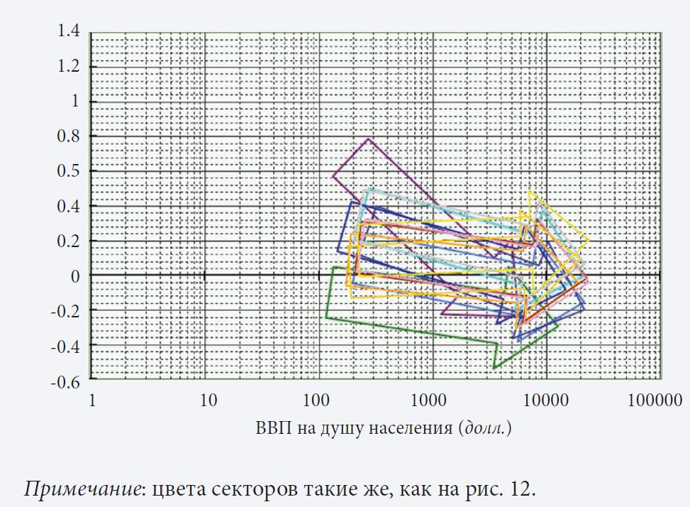 Рис. 13. Tемпы роста секторов как функция общего подушевого ВВП (абсолютные значения)