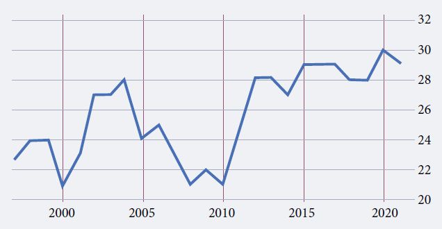 В России предпринимаются постоянные усилия по снижению уровня коррупции, которая признана одним из самых серьезных вызовов. Страна входит в число государств с наивысшими значениями Индекса восприятия коррупции (Corruption Perceptions Index) (рис. 1), что побудило правительство принять жесткие меры по ее преодолению. Действующий Национальный план противодействия коррупции на 2021–2024 гг. — наиболее долгосрочный с начала реализации антикоррупционной кампании. Он включает 16 направлений, устраняющих пробелы предыдущих программ.