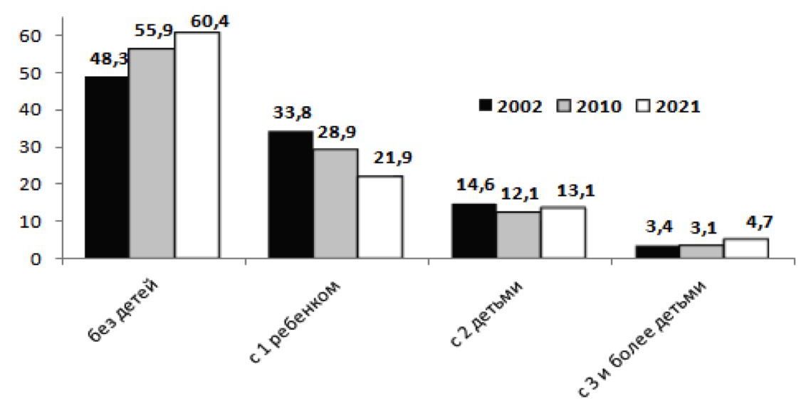 Противоречия развития рынка жилья, строительство на протяжении уже многих лет многоэтажного жилья с миниквартирами – предложение, которое сформировало и продолжает усиливать спрос на жильё со стороны небольших домохозяйств без детей и одиноко проживающих. А если посмотреть на демографические тенденции и изменения за период между Всероссийскими переписями населения 2010 и 2021 годов, то количество домохозяйств без детей заметно увеличилось и достигло 60,4% от всех домохозяйств из двух и более человек (рисунок 8).
