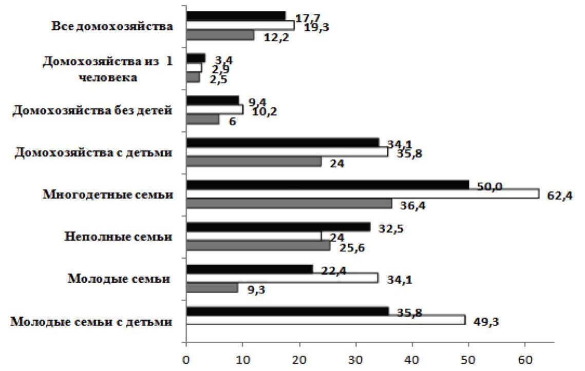 Что касается субъективных оценок, то доля домохозяйств, указавших на стесненность при проживании, вполне соотносится с фактическими квадратными метрами. Особенно велико недовольство в городах: среди семей с детьми – 35,8%, в том числе многодетных – 55,7% и молодых семей – 40,4% (рисунок 4).