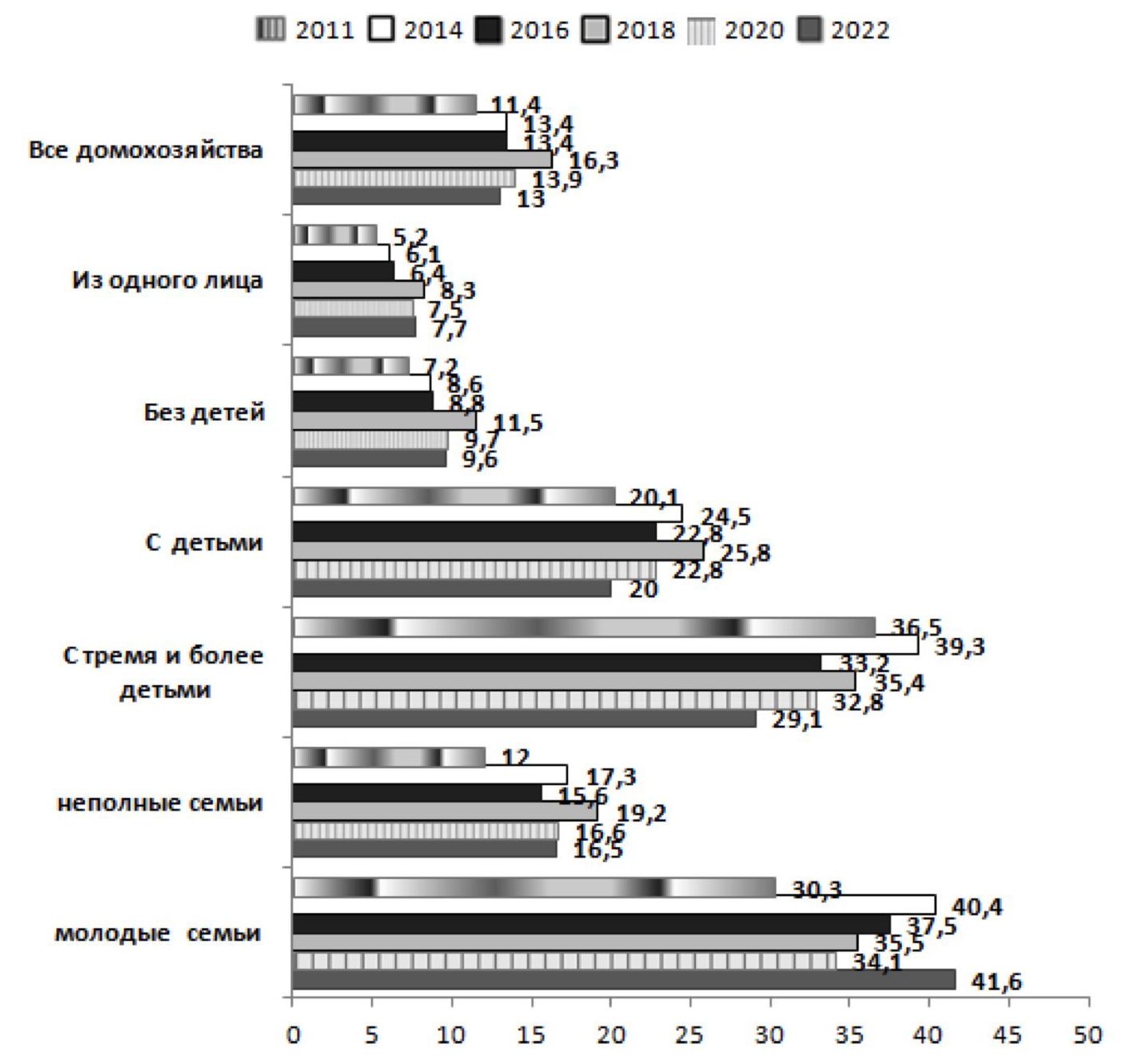 In the implementation of effective family policy, a place is ensured by ensuring affordable housing. The object of our study was households with children, inclusion - their housing security. The purpose of the study is to identify problems associated with improving the living conditions of households with children in Russia. For the analysis, data from representative monitoring sociological surveys of households «Comprehensive observations of the living conditions of the population» conducted by Rosstat in 2011-2022 were used. Estimates of housing рrovision were obtained depending on the socio-demographic composition of households. Households with children are characterized by a marked deterioration in housing conditions in the presence of two or more children, cramped housing, especially urban apartments, living in individual houses of large families, and a low level of improvement of their homes. For the worse, large and young families stand out. The dynamics of housing provision shows that with an increase in the average Russian indicators, the situation of families with children is not getting better. At the same time, housing provision for households without children is growing, especially those living alone. The consequences of the mass construction of multi-storey small-sized housing over the years have been investigated. It is shown that this has influenced demographic indicators towards an increase in the proportion of households without children, especially single ones. With such trends, the implementation of a family policy aimed at increasing the birth rate seems problematic. More than half of large families live in their own homes rather than apartments. The actual living conditions and preferences of families with children suggest that for them the massive construction of individual housing could be one of the main means of solving the housing problem. The primary task is also to increase the level of housing improvement and the development of road and engineering infrastructure. A State social policy is needed to improve housing рrovision for families with children.