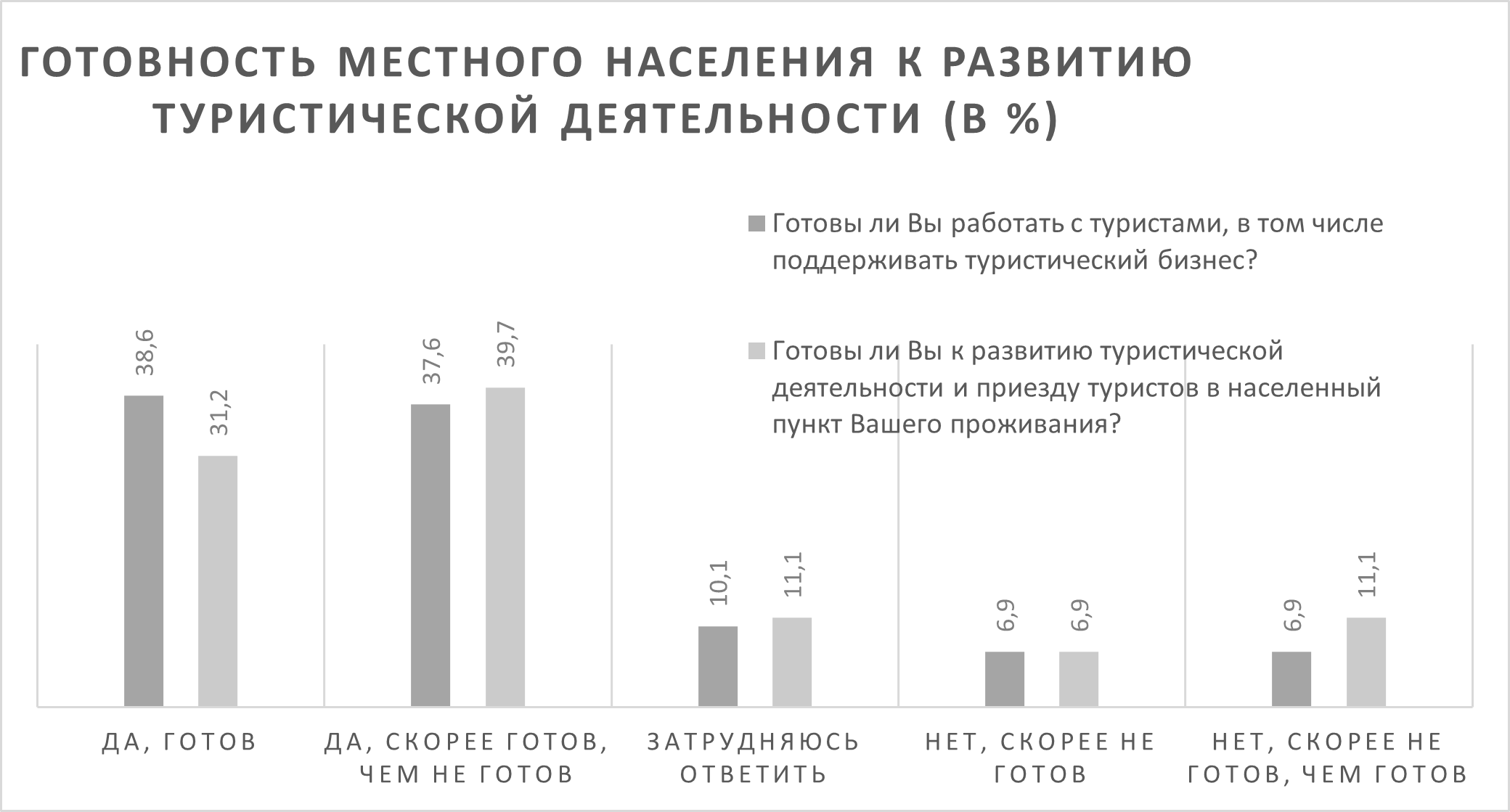 По полученным результатам можно наблюдать сомнения в готовности местного населения как к работе с туристами, так и к их приезду. При этом доля выразивших готовность к развитию туристической деятельности и работе с туристами является относительно небольшой, не более 40% от всех опрошенных. Выявлено, что к развитию туризма готово – 31,1%, а к работе с туристами готово 38,6% респондентов. Так, к скорее не готовых к развитию туризма – 11,1%, а скорее не готовых к работе с туристами – 6,9%.