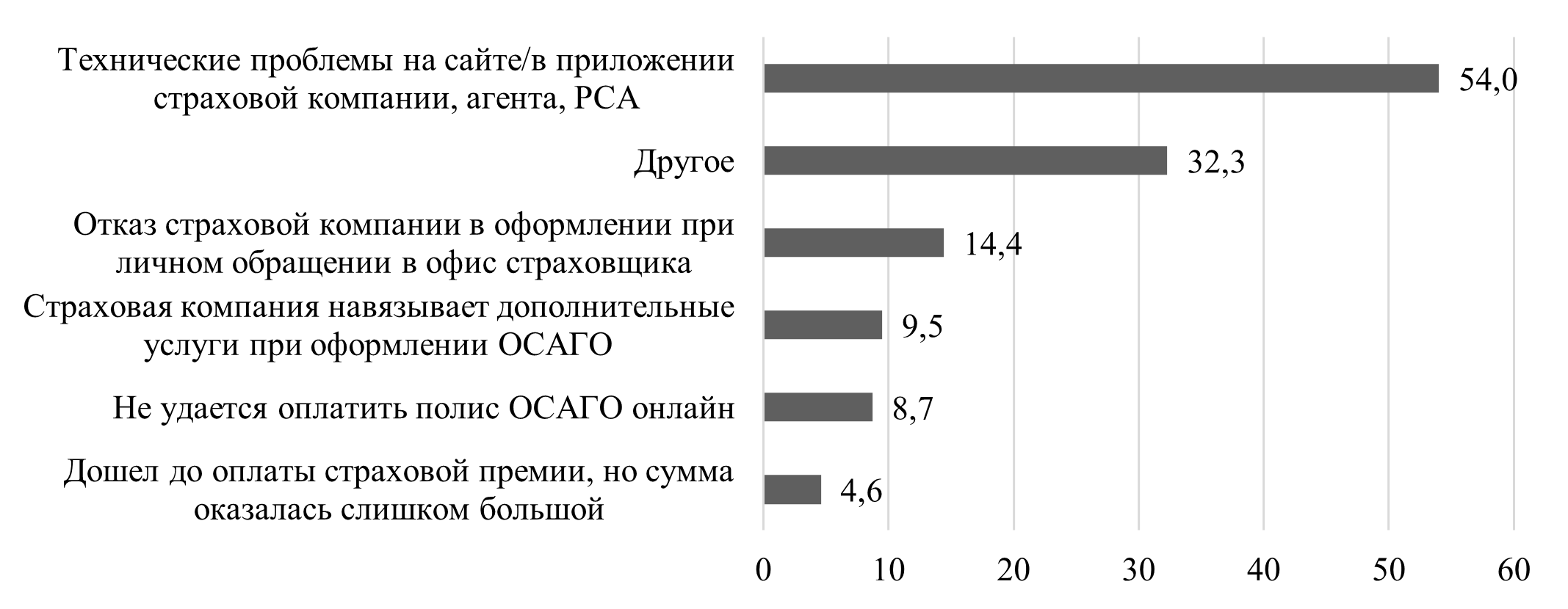 Наиболее распространенной проблемой оформления полиса являются технические неполадки на сайте / в приложении страховой компании, агента или РСА, так ответили более половины автомобилистов. 14,4% респондентов при личном обращении в офис страховщика получили отказ страховой компании. Практически каждый десятый сталкивался с навязыванием дополнительных услуг при оформлении полиса ОСАГО. 8,7% не смогли оплатить полис онлайн, 4,6% отметили, что страховая компания запросила неожиданно высокую страховую премию. К «другим» респонденты отнесли такие проблемы как отказ из-за возраста, стажа вождения, особенностей автомобиля, а также, связанные с долгим ожиданием страховки.