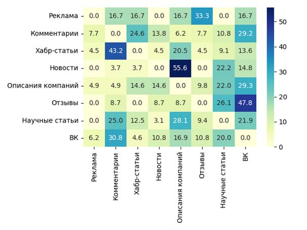 Для классификации с помощью комбинации трех уровней лингвистических характеристик была построена матрица ошибок (Рис. 1). В матрице в каждой строке указываются проценты от суммарного количества ошибок. Наибольший процент ошибок возникает, когда новости принимаются за описания компаний (55.6 %) и когда отзывы принимаются за посты ВК (47.8 %). Реклама классифицируется лучше всего: ошибки с ее текстами совершаются более-менее равномерно, и за нее принимаются наименьшие доли других жанров. Больше всего тексты ошибочно принимаются за комментарии, описания компаний и посты ВК. В этих столбцах наибольшие доли ошибок.