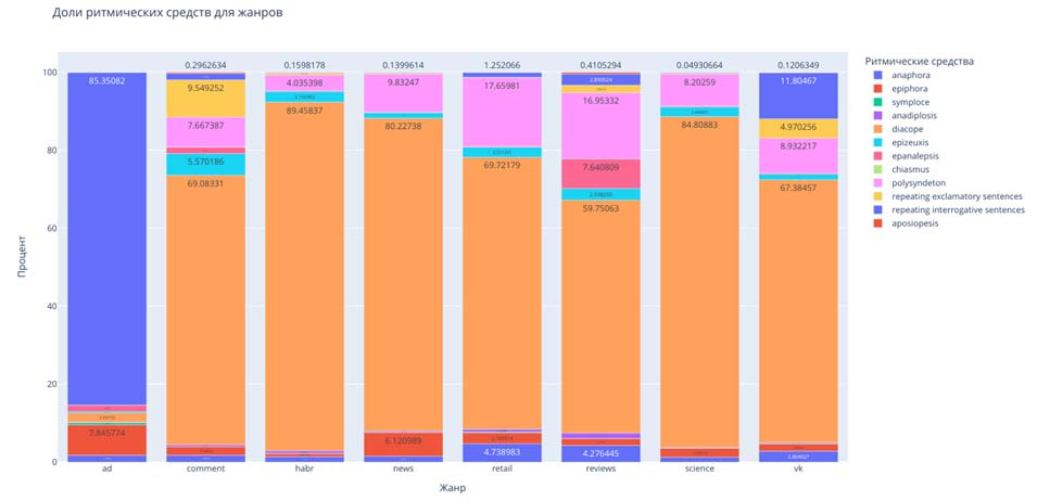 Рис. 3. Соотношение ритмических средств в текстах анализируемых жанров