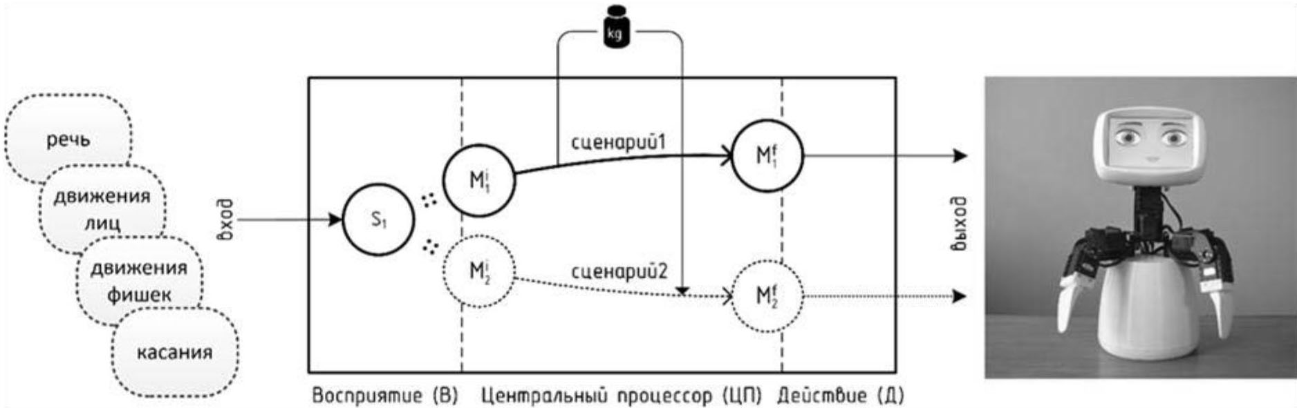 Для экспериментов по человеко-машинному взаимодействию мы разрабатываем робота Ф-2, который управляется системой сценариев: правил или продукций типа «если-то». Если в систему сценариев поступает событие, соответствующее посылке одного из сценариев, данный сценарий активизируется и может передать на робота некоторое действие – элемент поведения, описанный на языке Behavior Markup Language – BML [14, 15]. Это может быть жест – движение рук, движение головы или глаз, а также речевое высказывание. Таким образом, базовая схема сценариев соответствует понятию рефлекса, или инстинкта [16]: сценарий заставляет организм выполнять некоторое действие при обнаружении определенной ситуации. Базовая схема этой модели представлена на Рис. 1.