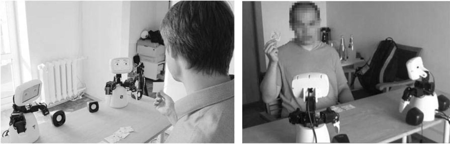 Такая установка обеспечивала более высокую точность системы распознавания пользователя, которая определяла ориентацию лица, а не сам взгляд. Испытуемый мог общаться с левым и правым роботом из одной и той же позиции за столом, поэтому роботы постоянно поддерживали соответствующее поведение: например, каждый робот отвечал на взгляд пользователя, даже если тот рассказывал историю другому роботу (Рис. 4). После эксперимента испытуемые должны были выбрать наиболее понравившегося им робота, а также оценить каждого робота по пятибалльной шкале привлекательности. Испытуемые также заполняли анкету, в которой описывали свои впечатления от взаимодействия с роботами, оценивали роботов по шкалам семантического дифференциала и проходили тест эмоционального интеллекта ЭмИн.