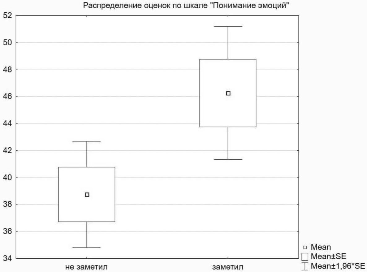 Рис. 6. Уровень эмоционального интеллекта людей, заметивших и не заметивших разницу между вариантами глазодвигательного поведения робота