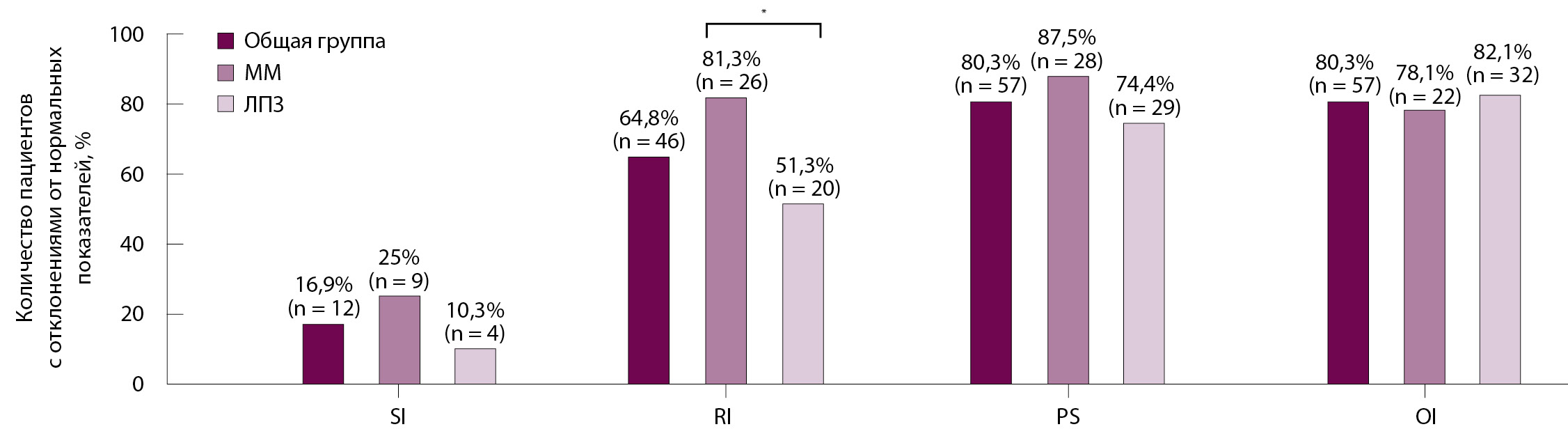 Рис. 1. Частота выявления нарушений артериальной функции у пациентов с гемобластозами до проведения высокодозной химиотерапии с аутологичной трансплантацией гемопоэтических стволовых клеток. Данные представлены в виде абсолютных и относительных значений; OI – индекс окклюзии, PS – сдвиг фаз, RI – индекс отражения, SI – индекс жесткости; * наличие статистически значимых (р < 0,05) различий между группами пациентов с множественной миеломой (ММ) и лимфопролиферативными заболеваниями (ЛПЗ)